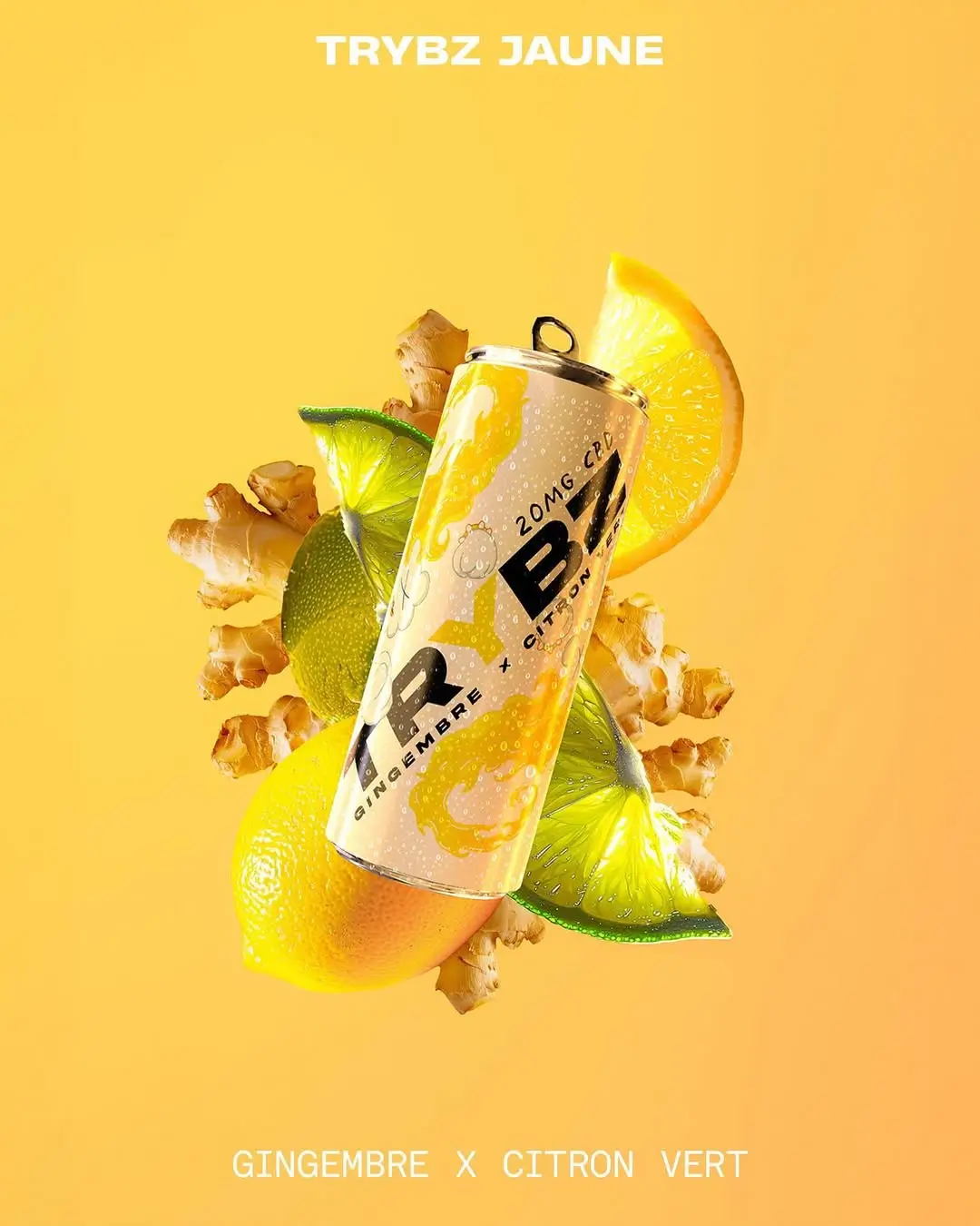 Eau gazéifiée, sucres issus de fruits, jus de gingembre* (25 %), extrait de gingembre, émulsion de CBD (20 mg/250 mL), acidifiant : acide citrique, arôme naturel de gingembre, arôme naturel de citron vert. *Issus de l’agriculture biologique.