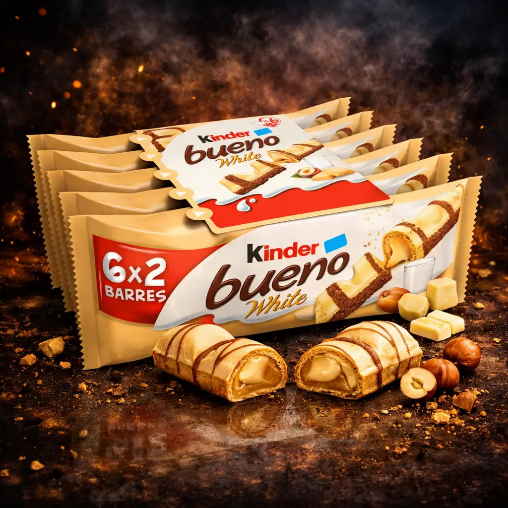 Cette version combine parfaitement la texture légère et croustillante de la gaufrette Kinder Bueno avec une crème onctueuse aux noisettes, le tout recouvert d’un chocolat blanc délicat et fondant.