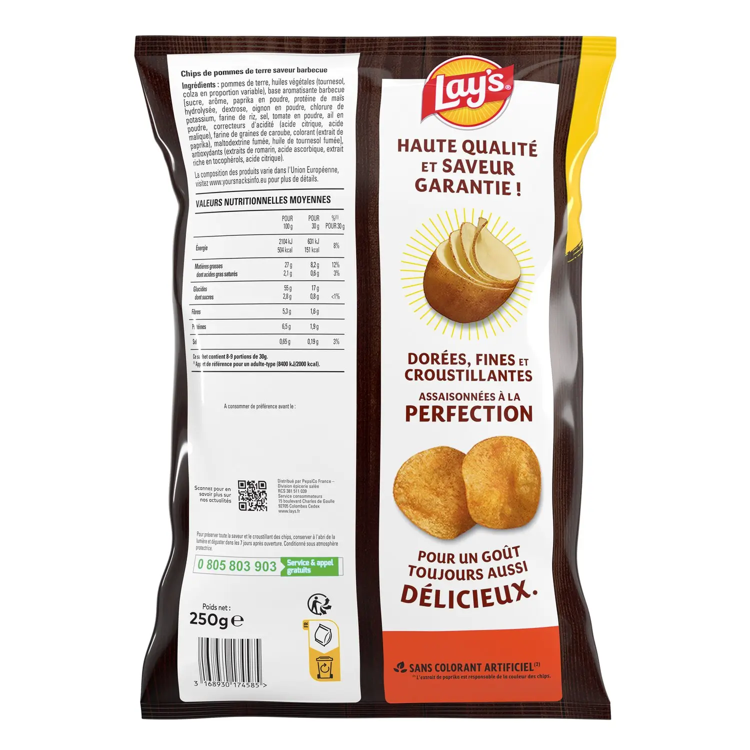 Les chips Lay’s Barbecue sont préparées à partir d’ingrédients soigneusement choisis afin d’obtenir une texture croustillante et un goût riche. La base de la recette repose sur des pommes de terre sélectionnées et des huiles végétales qui permettent d’obtenir une cuisson parfaite.
